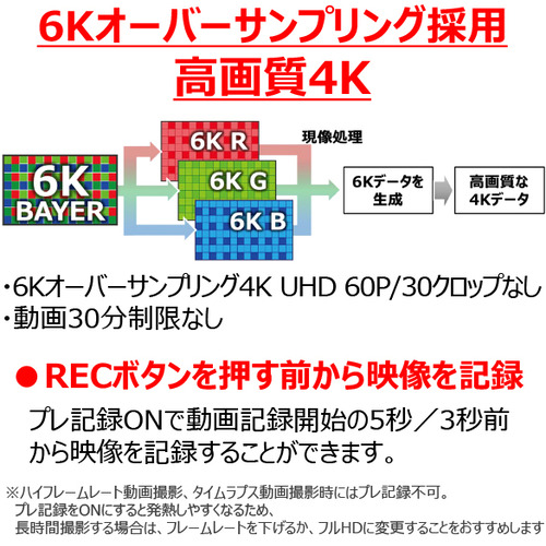 6Kオーバーサンプリングにより、高画質な4Kで記録。フルHD/180Pのハイフレームレート動画、4Kタイムラプス、静止画同様の強力なAF&トラッキング性能、最大2時間00分00秒に拡大した動画撮影時間など、クリエイターの表現力に応えます。