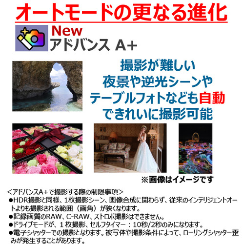 動画撮影機能:4K UHD/4K UHDクロップ/4K UHD タイムラプス動画※:3840×2160(16:9)フルHDハイフレームレート動画/フルHD/フルHD クロップ/フルHD タイムラプス動画/HDR動画/クリエイティブフィルター:1920×1080(16:9)