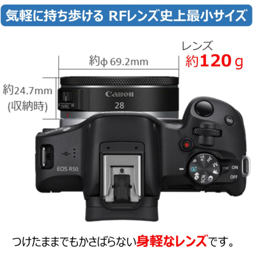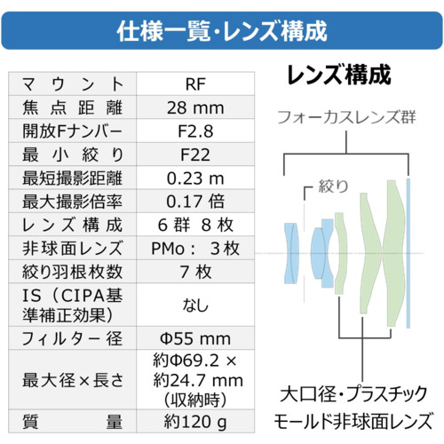 3枚の大口径・高精度PMo(プラスチックモールド)非球面レンズをセンサーの手前に配置することで、レンズ構成枚数を少なく抑えながら中心から周辺まで優れた描写性能と小型化を両立。小型軽量なEOS R シリーズのカメラとの組み合わせで、優れた携帯性を実現するほか、レンズをつけたままでもかさばらない身軽なレンズです。