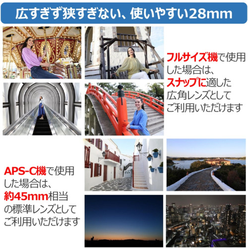 フルサイズカメラ装着時は広角28mm F2.8レンズとして使用可能。室内でも撮りやすい広い画角と、適度に強調された遠近感を活かした撮影表現が可能で、風景写真やスナップなど幅広い撮影シーンに使えます。APS-Cサイズカメラ装着時は標準45mm相当のF2.8レンズとして使用可能。標準レンズならではの自然な遠近感と、被写体とコミュニケーションがとりやすい適度な距離感で、ポートレートやスナップ、料理写真、テーブルフォトなど幅広い撮影シーンを気軽に切り取れます。 【仕様】