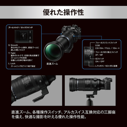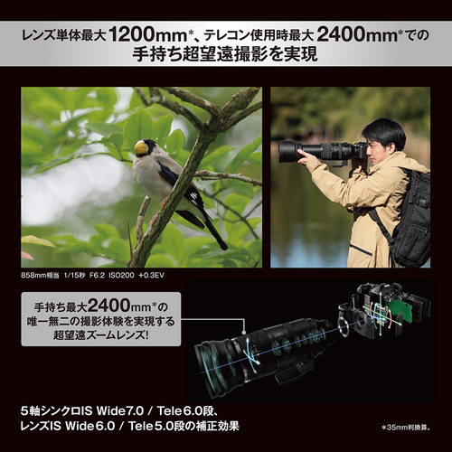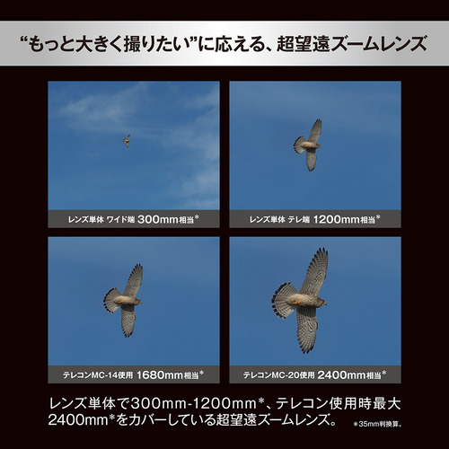 ●最大 1200mm(35mm 判換算)、2 倍テレコンバーターの併用で最大 2400mm(35mm 判換算)の超望遠撮影が可能なズームレンズ