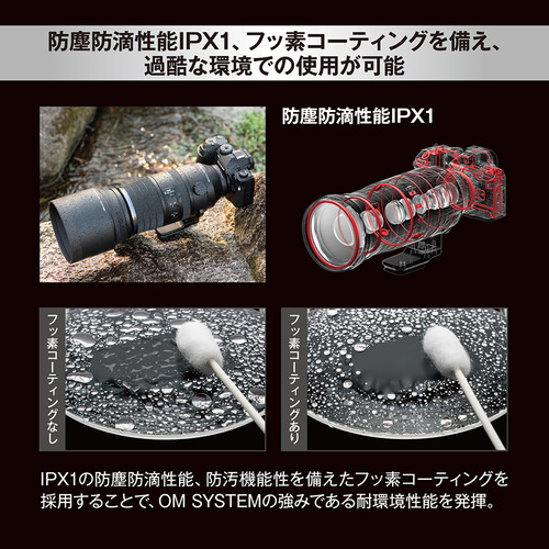 最前面のレンズにはフッ素コーティングが施されていますので、雨粒、ごみ、ホコリ等の汚れがついた場合でも軽いふき取りで除去することができ、すぐに撮影を再開できます。