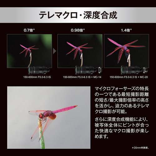 レンズ単体では 300-1200mm 相当(35mm 判換算)、さらに別売のテレコンバーター「M.ZUIKO DIGITAL 1.4x Teleconverter MC-14」、「M.ZUIKO DIGITAL 2x Teleconverter MC-20」にも対応し、テレコンバーター「MC-20」を装着すると600-2400mm 相当(35mm 判換算) となります。これにより圧倒的な超望遠撮影が可能になり、近づくことが困難な野鳥や動物、昆虫などを狙ったネイチャーフィールドでの撮影に大きく貢献します。