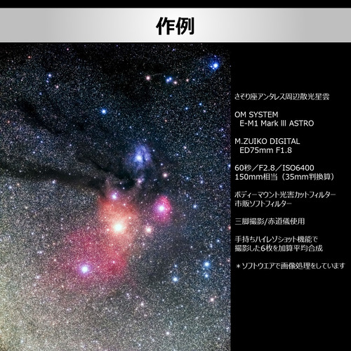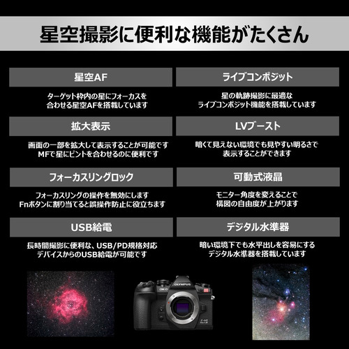 本製品はミラーレス一眼カメラ「E-M1 Mark lll」をベースに、天体写真愛好家に人気の高い赤い星雲も色鮮やかに撮影できるようチューニングした天体撮影専用カメラです。