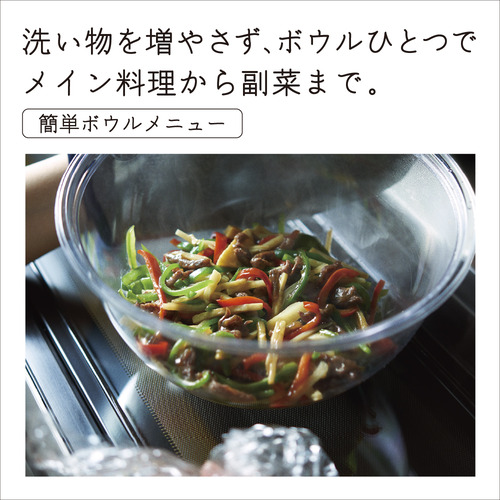 「野菜シャキシャキメニュー」や「最短1分スピードメニュー」、煮物やいため物など、ボウルひとつでメイン料理から副菜までつくれるので、レパートリーが広がります。調理は、耐熱プラスチックボウル(※1)と耐熱ガラスボウルが使えます。ボウルの種類をオートで見分けるから容器設定が不要です。※1 耐熱プラスチックボウルは耐熱温度140℃以上のものをお使いください。