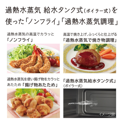 過熱水蒸気とオーブンを使い、油を使わずにカラッとフライ調理ができる「ノンフライ」や、過熱水蒸気を庫内に充満させながら調理し、しっかり焼き上げ、ふっくらと仕上げる「過熱水蒸気で焼き物調理」ができます。オーブンと過熱水蒸気で、揚げ物の衣をサクッと中までしっかりあたためる「揚げ物あたため」も搭載。