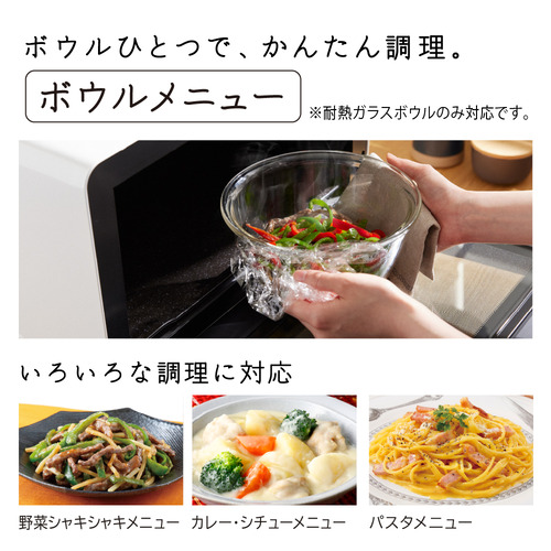 ボウルひとつで簡単調理「ボウルメニュー」(※)には「野菜シャキシャキメニュー」や「カレー・シチューメニュー」「パスタメニュー」が搭載。その他「冷凍からラクラクメニュー」や「冷凍食品パリッと調理」、「スピードメニュー」なども搭載。※ 耐熱ガラスボウルのみ対応です。