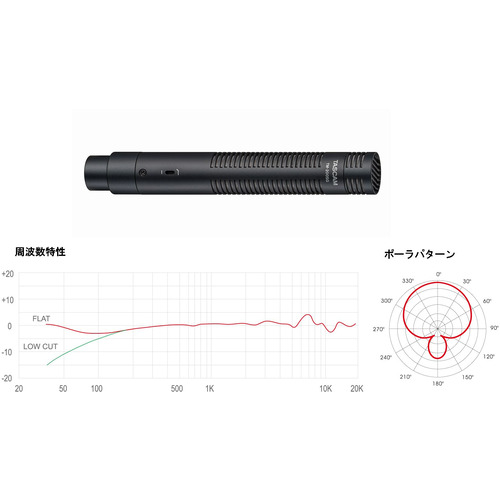 超単一指向性、風や環境ノイズを抑制するローカットフィルターを装備、+48Vのファントム電源供給で動作、TASCAMロゴつきウインドスクリーン、マイクホルダー(シューマウントタイプ)、専用ソフトケース付属。