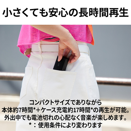 小型軽量のスティック型ボディでありながらイヤホン本体のみで最大7時間※2、充電ケースによるフル充電を合わせると最大24時間※2の長時間再生が可能です。※2:使用条件により変わります。