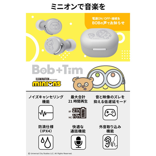 「Bob」と「Tim」の特別描き下ろしスケッチや、「Bob」のキャラクターボイスを採用したワイヤレスイヤホン。オーディオメーカーならではのクリアで躍動感ある心地よいサウンドで音楽を楽しめます。