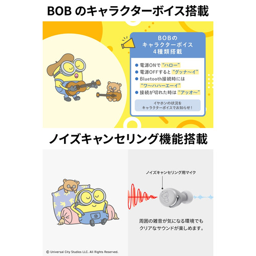 電源ON/OFF、ワイヤレス接続/切断を、「Bob」のキャラクターボイスでアナウンスします。