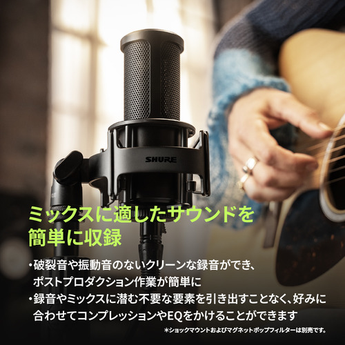 スタジオ用の機材を長年製造してきたShureによる堅牢なオールメタル構造と、極めて高い音圧レベル(SPL)にも対応する処理能力。洗練された薄型デザインは、演奏者や周囲の環境を邪魔しません。