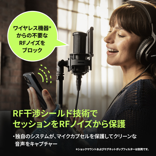 スマートフォンやWi-Fiルーターなど、ワイヤレスデバイスからの不要なRFノイズをブロックします。独自の内蔵型ポップフィルターとメッシュ織のファラデーケージにより、クリーンな音声をキャプチャーします。