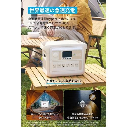 Anker独自の急速充電技術により、100%充電までわずか58分。キャンプの朝に充電忘れに気づいたり、突然の台風で停電の可能性があっても、充電の不安がなくなります。※2023年9月時点 1000Wh帯において、20°Cのテスト環境下におけるAnker調べ。専用アプリで超急速充電モード設定時。