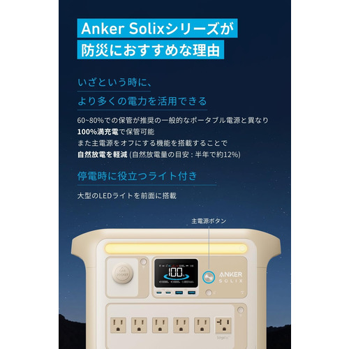 一般的なポータブル電源と異なり、本製品は充電100%で長期保管できるだけでなく、主電源のOFF機能を新たに搭載することで、自然放電も抑制 (半年で約12%)。いざという時に最大限の電力を残すことができます。