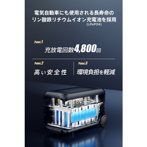 ●安全性が高く、長寿命のリン酸鉄リチウムイオン充電池(LiFePO4)を採用。