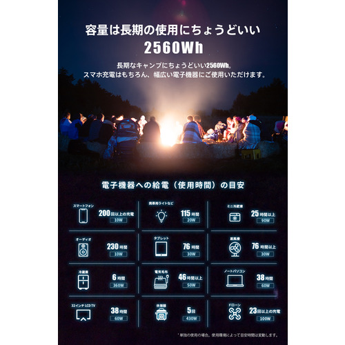 ●容量は長期の使用に安心な2560Wh