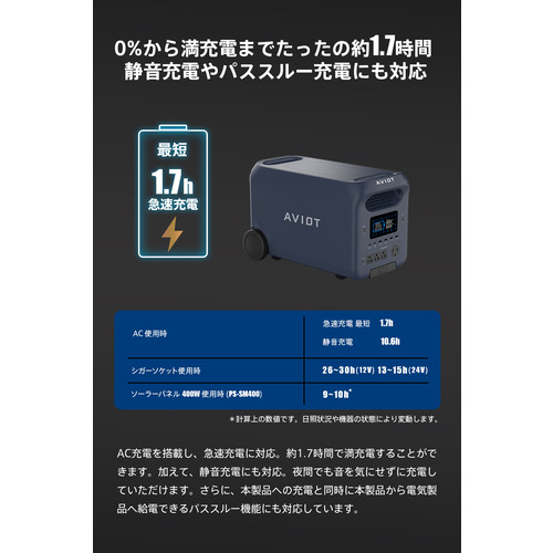・ソーラーパネル400W使用時(PS-SM400) :9〜10時間