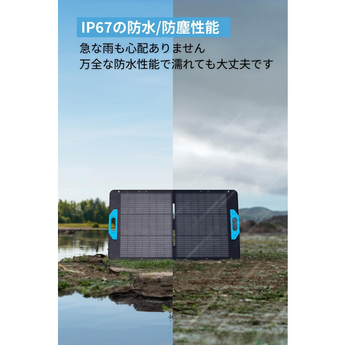 高効率な単結晶パネルを採用し、小型軽量サイズながら最大100Wの発電性能を備えます。発電から出力間の電力ロスが発生するため、理想的な晴天時において、ポータブル電源を約85W(※)で充電できます。(※Anker 521のように、ポータブル電源の最大入力値が65Wの場合はソーラーパネルからの入力も65W以下になります)
