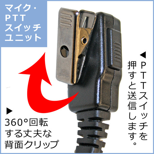 耳掛けフックは脱着が可能。耳掛けタイプ、または耳掛けフックを外してインナータイプとしても使用することが出来る2WAYスタイルのトランシーバー用イヤホンマイクです。また、耳掛けフックの方向を組み替えることで、左右どちらの耳にもフィットします。