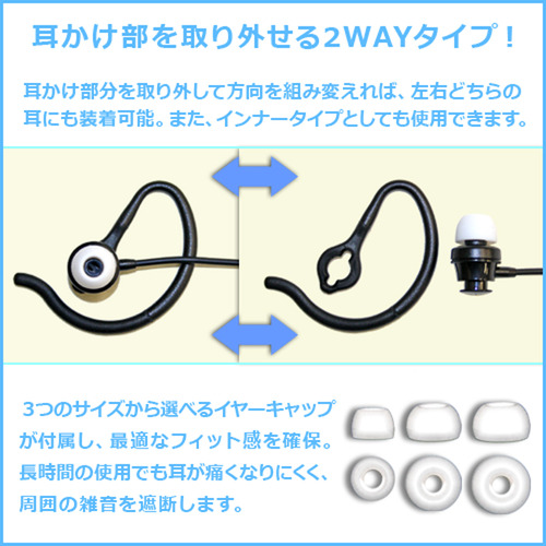 耳掛けフックは取り外しが可能ですので、インナータイプ、耳掛けタイプの2通りの使い方が選べる2WAYタイプです。