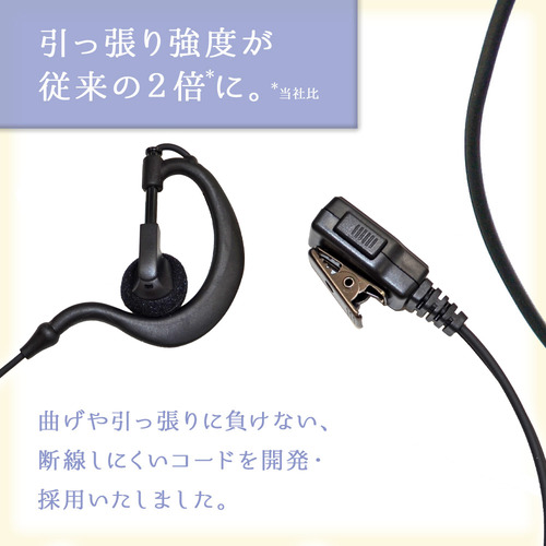 ●耳掛け式のイヤホンマイク付ハングマイクロホンです。 激しい動きにも強く、長時間使用しても疲れません。衣類の襟元などにクリップで装着して手動による送信が可能。