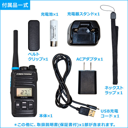 セット内容:本体×1、充電池×1、充電用ACアダプタ×1、USB充電ケーブル×1、充電器スタンド×1、ベルトクリップ×1、ネックストラップ×1、取扱説明書(保証書付)×1