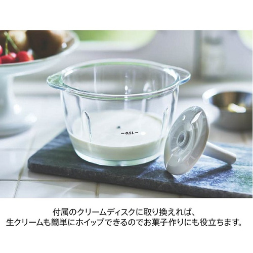 付属のクリームディスクに取り換えれば、生クリームも簡単にホイップできるのでお菓子作りにも役立ちます。