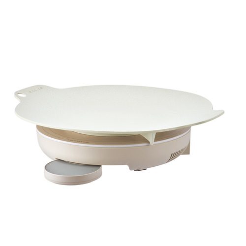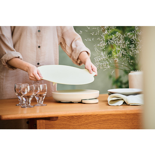 [卓上IHクッキンググリドル]は、新スタイルのホットプレート。調理できる大皿[クッキンググリドルプレート]と円形フォルムの[卓上IHヒーター]をセットにしました。