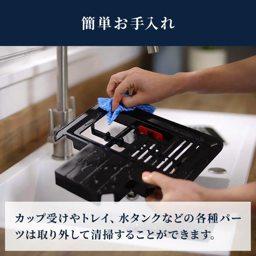 低速回転で摩擦熱を抑えながら均一にコーヒー豆を挽くコーン式グラインダーを採用し、揮発性のアロマを損なわずコーヒー豆本来の風味を生かします。