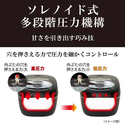 今回、新圧力構造にしたことにより、電磁機能部品 ソレノイドの押す力加減で、圧力を段階的に分けて調整。段階的に圧力をコントロールすることで、仕上げ段階の蒸らし温度を高く維持させながら、やさしく温度変化させ、お米の甘みを引き出し、一粒ひと粒が存在感のあるごはんを実現します。