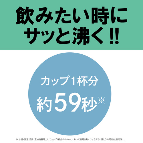 タイガー独自技術により、とっ手部分にある蒸気検知センサーまで、蒸気を最短経路で誘導。素早く蒸気を検知し、沸とうしたらすぐに電源オフすることで、スピード沸とうを実現。忙しい朝や、急な来客、慌ただしい家事の合間にもお湯が驚きの速さですぐに沸かせます。※水温・室温23度。定格消費電力にて、カップ1杯分約140mLにおいて通電自動オフするまでの沸とう時間(自社測定法)。