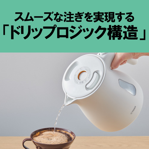 タイガー独自の「ドリップロジック構造」で狙った場所にブレずに注げて、お湯の飛び散りも抑えます。