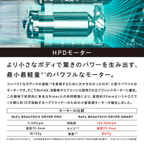 世界的モーターメーカーNidecと共同開発したヘアドライヤーのためのReFaブランドにおいて最小最軽量でパワフルな「HPDモーター」を搭載。