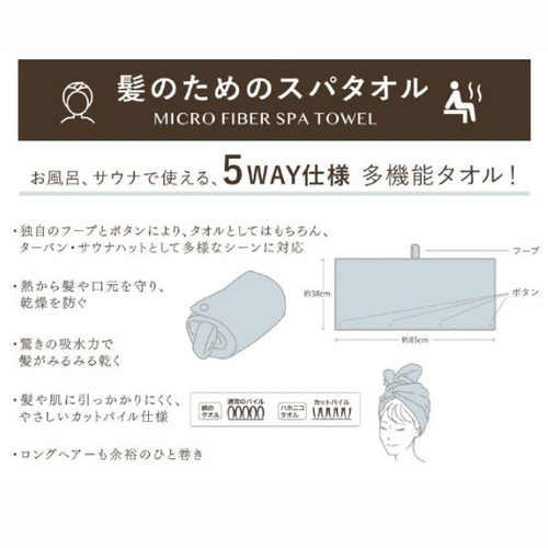 ●スパタオルは、スパやサウナをより快適に楽しみながらヘアケアもするこれまでにない機能性と実用性に優れた「髪のためのスパタオル」です。