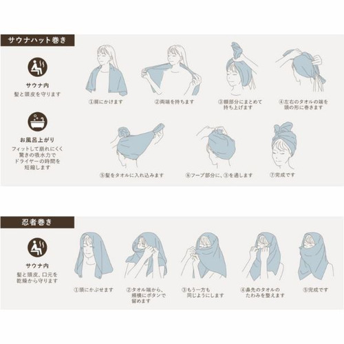 (1)忍者巻き:髪や頭皮、口元をしっかりカバー。乾燥対策に。(2)サウナハット巻き:頭部全体をカバーし、髪と頭皮の保湿ケアに。お風呂あがりはターバンとして、サウナ内ではサウナハットとして。(3)没頭巻き:視界を遮断。瞑想や外気浴時に。(4)ズキン掛け:簡単に頭部をカバーし、のぼせ防止に。(5)肩にかけて使用:首から肩にかけてカバーし、濡れ防止に。