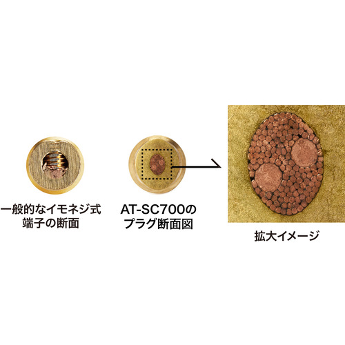 導線と端子の接続方法において、一般的なイモネジで導線を固定するプラグの場合、電気的な接触面が小さくなってしまう懸念があります。