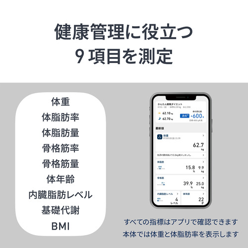 9項目全ての指標はプリで確認できます。本体委では体重と体脂肪率を表示。■測定項目:体重・体脂肪率・体脂肪量・骨格筋率・骨格筋量・体年齢・基礎代謝・BMI・内臓脂肪レベル