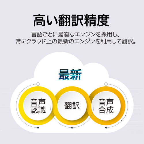言語ごとに最適なエンジンを自動で選択し、高い翻訳精度を実現しています。ノイズキャンセルマイクと大型スピーカーを搭載し、騒がしい環境でも精度高く使えます。