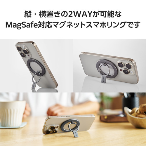 ●MagSafe対応iPhoneの背面に磁石の力で取り付けることができる、MAGKEEPスマホリングです。磁力で着脱できるので、ワイヤレス充電や電子決済に素早く対応できます。リング部分はスタンドとしても使用でき、横向きだけでなく、縦向きにも対応したオリジナルのデザインです。横向きの動画はもちろん、縦向きのショート動画も見やすいスタンドです。