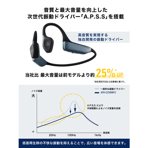 前モデルより音質と最大音量を向上した次世代の振動ドライバー(PAT.P)を搭載。耳珠(じじゅ)と呼ばれる軟骨部に当てて装着するだけで、高音質リスニングやクリアな通話が可能です。ドライバーに当社独自の「A.P.S.S」を採用し、外部振動による音質劣化を防ぎ、低音再生時の不快な振動を抑えることで、広い音場を体感できます。