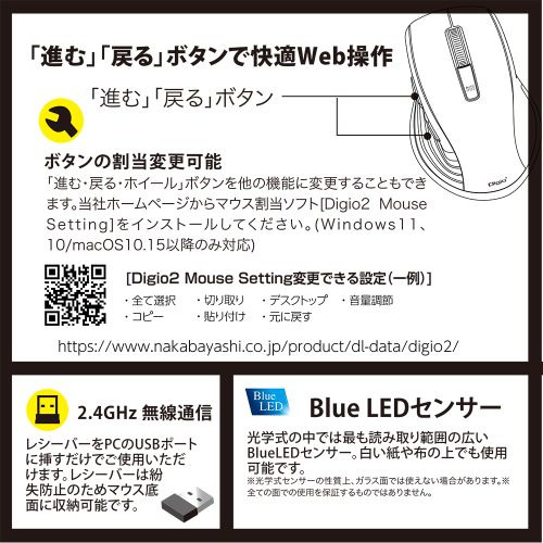 当社ホームページからダウンロードできるマウス割当てソフト【Digio2 Mouse Setting】を利用すればホイール・進む・戻るボタンを他の機能に変更することができます。変更できる設定(一例)・全て選択・コピー・切り取り・貼り付け・デスクトップ・元に戻す・音量調節  Windows11、10 macOS10.15以降のみ対応