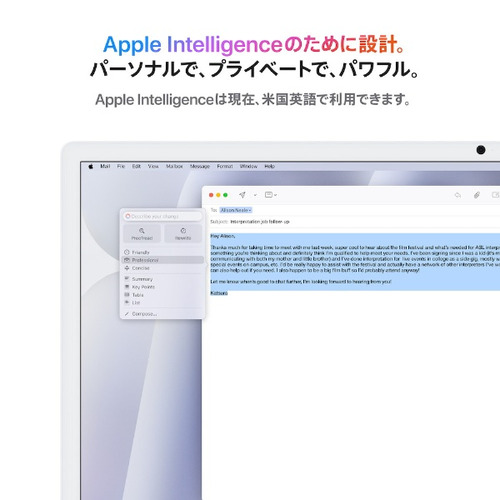 ※1 Apple Intelligenceは、M1以降を搭載したMacの全モデルで、macOS Sequoiaのアップデートの一部としてベータ版で利用できます。Siriとデバイスの言語を英語(米国)に設定する必要があります。英語(オーストラリア、カナダ、アイルランド、ニュージーランド、南アフリカ、英国)には今年の12月に対応します。一部の機能の公開と日本語、中国語、英語(インド、シンガポール)、フランス語、ドイツ語、イタリア語、韓国語、ポルトガル語、スペイン語、ベトナム語などの追加言語への対応は、今後1年にわたり開始される予定です。