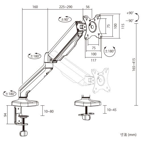 可動範囲:垂直+90°/-90°、水平+90°/-90°、回転+180°/-180°