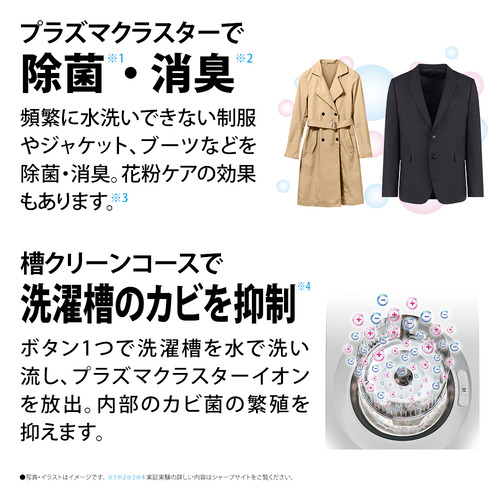 お手入れが大変な乾燥ダクトと洗濯槽をダブルで自動お掃除。乾燥ダクトと排気口についた洗剤成分と糸くずを、次の洗濯時の給水を利用して自動で洗い流し、乾燥効率の低下を防ぎます。洗濯するたびに洗濯槽の裏側を洗い流してくれる「洗濯槽自動お掃除」を搭載、洗濯槽の裏側を除菌・黒カビ抑制して、清潔に保ちます。衣類を乾燥しながら、プラズマクラスターで除菌する「プラズマクラスター除菌乾燥」で清潔にお洗濯。さらに、頻繁に洗えないコートやジャケット、水洗いできないブーツなどもプラズマクラスターで除菌・消臭できます。