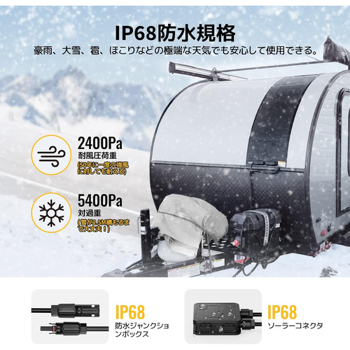 ソーラーパネルの底板には、50ミクロンの鋼板を採用し、柔軟性と耐衝撃性を確保。また、ソーラーパネル全体はIP68の防水防塵仕様、耐風圧2400pa、対過重5400paで、極端な天候でも安心して使用可能。