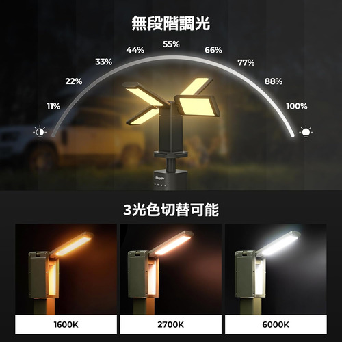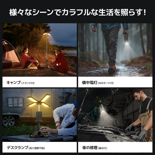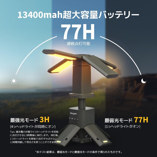 1500lm×4高輝度で夜間のアウトドア活動をしっかりサポート。また、13400mAhの大容量バッテリーを内蔵しており、最長77時間の連続照明が可能です。キャンプや災害時、あらゆるシーンで頼れるLEDライトです。