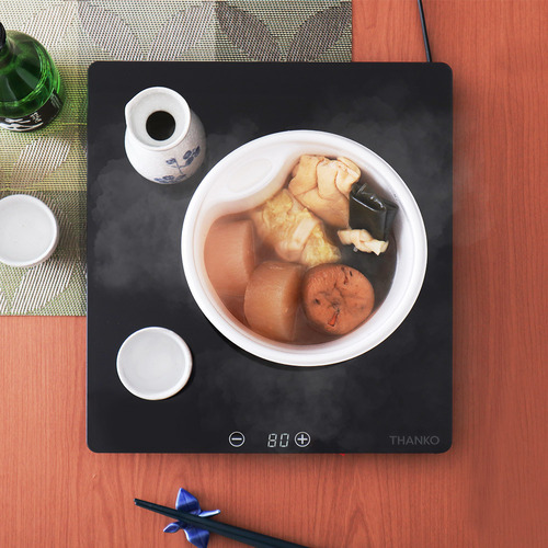 60〜110度までの温度調整ができ、食品を食べ終わる最後までアツアツで保つことができる保温プレート