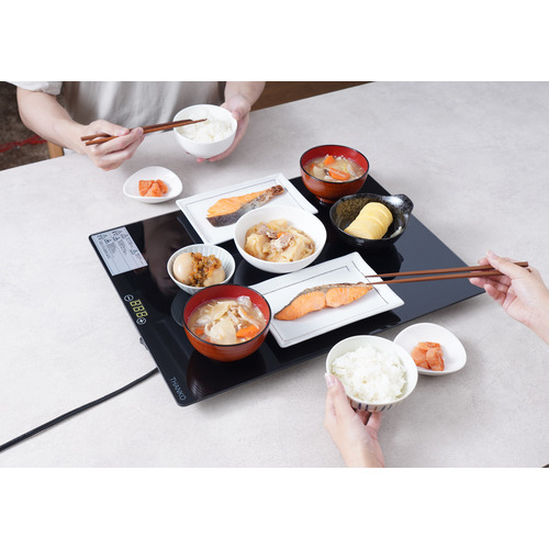 60〜110度までの温度調整ができ、食品を食べ終わる最後までアツアツで保つことができる保温プレート