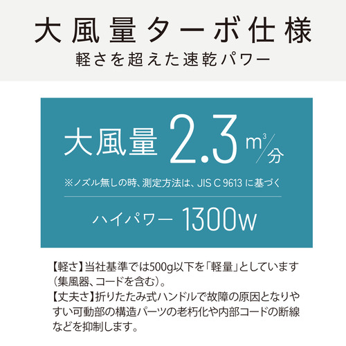 ●大風量2.3立米/分で高速乾燥、腕が疲れない軽量約460g